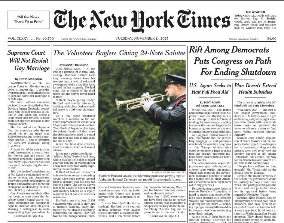The New York Times interviewed Dr. Matthew Burford and featured him in an article about volunteering to play Taps at military funerals. It is such an honor to be able to play Taps for veterans who need a dignified send off with true military honors. We are proud of Dr. Burford, and hope you will read the full article below.